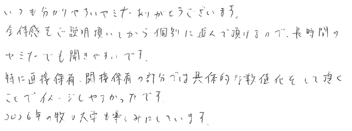 いつも分かりやすいセミナーありがとうございます。全体感をご説明頂いてから個別に進んで頂けるので、長時間のセミナーでも聞きやすいです。特に直接保有、間接保有の部分では具体的な数値化をして頂くことでイメージしやすかったです。2026年の牧口大学も楽しみにしています。