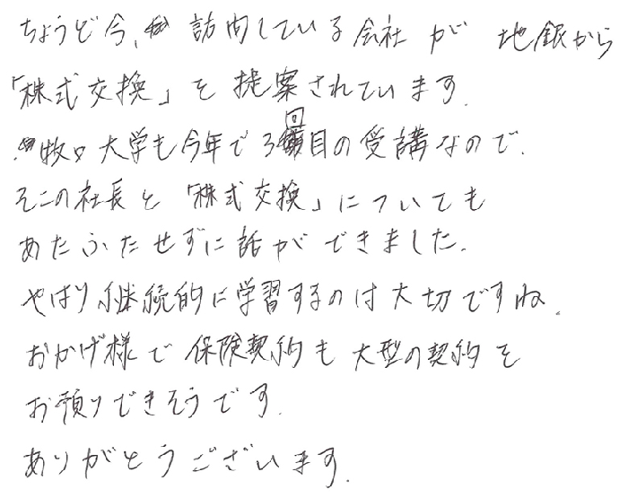 ちょうど今、訪問している会社が地銀から「株式交換」を提案されています。牧口大学も今年で3回目の受講なのでそこの社長と「株式交換」についてもあたふたせずに話ができました。やはり継続的に学習するのは大切ですね。おかげ様で保険契約も大型の契約をお預かりできそうです。ありがとうございます。