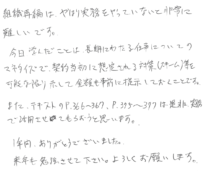 組織再編は、やはり実務をやっていないと非常に難しいです。今日学んだことは、長期にわたる仕事についてのマネタイズで契約当初に想定される対策(スキーム)等を可能な限り示して金額も事前に提示しておくことです。また、テキストのP.366~367、P.375~377は是非実務で活用させてもらおうと思います。1年間、ありがとうございました。来年も勉強させて下さい。よろしくお願いします。