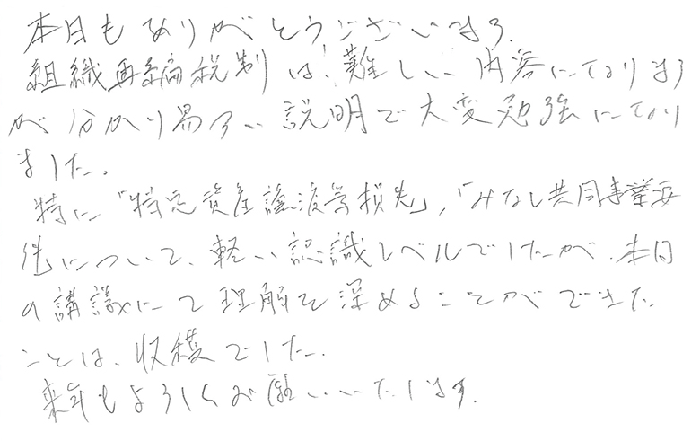 本日もありがとうございます。組織再編税制は難しい内容になりますが分かり易い説明で大変勉強になりました。特に「特定資産譲渡等損失」、「みなし共同事業要件」について、軽い認識レベルでしたが、本日の講義にて理解を深めることができたことは収穫でした。来年もよろしくお願いいたします。