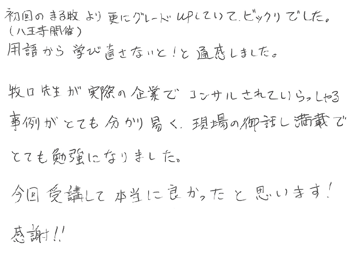 初回のまる牧(八王子開催)より更にグレードUPしていて、ビックリでした。用語から学び直さないと!と痛感しました。牧口先生が実際の企業でコンサルされていらっしゃる事例がとても分かり易く現場の御話し満載でとても勉強になりました。今回受講して本当に良かったと思います!感謝!!